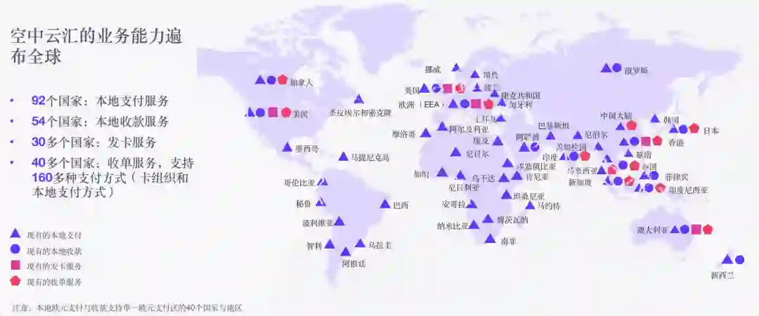Airwallex 空中云汇是一家全球金融科技公司,帮助全球用户进行收付款服务以及跨境支付等场景。构建了全球金融基础设施平台,支付网络已覆盖全球 130 多个国家和地区的 50 余种货币,为企业提供数字化的金融科技产品。