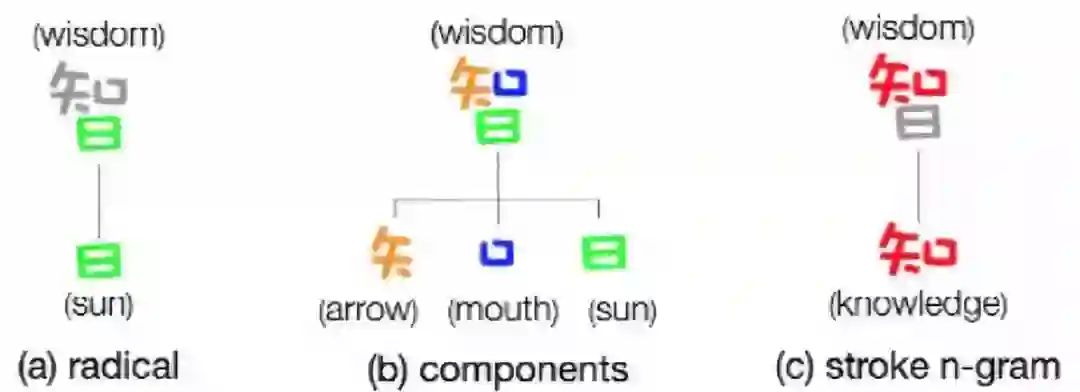 通过观察中文字符内部组成,发现中文字符包含偏旁部首、字符组件,笔画信息等语义信息特征(如下图),基于偏旁部首和汉字组件特征的中文词向量模型已经有人提出,并取得了较好的效果。