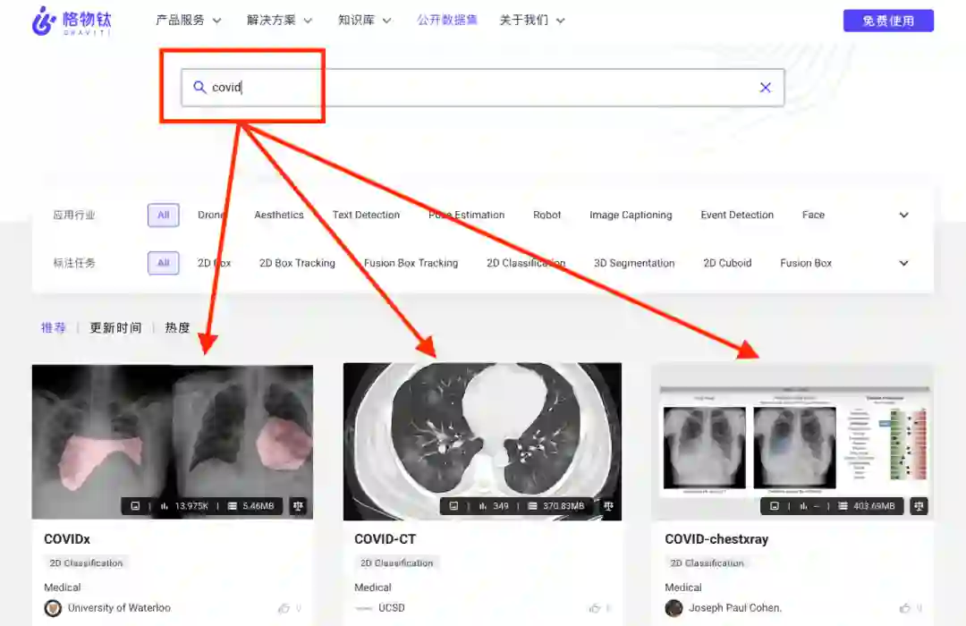 众所周知:找数据难,找海外数据更是难上加难。但拥有Graviti网站就像拥有一把万能钥匙——例如想进行最新的COVID肺部医学影像检测模型训练,只需要随手输入“COVID”即可一键抵达。