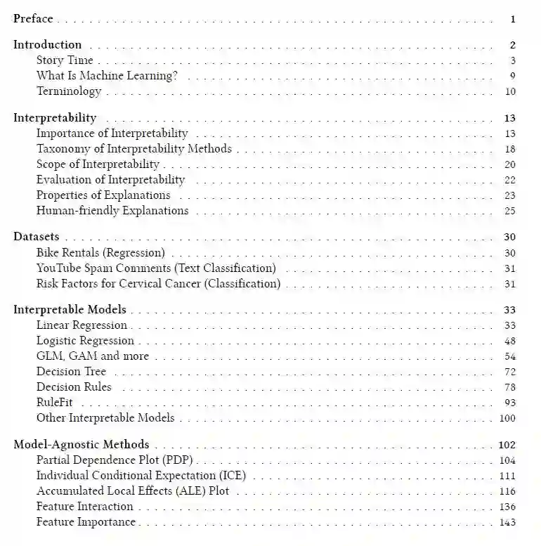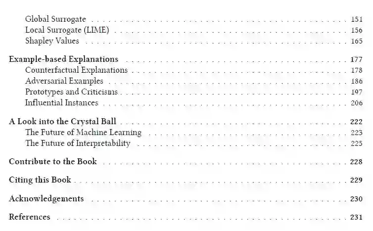 本书从一些(反乌托邦)短篇故事开始,这些短篇小说不是用来理解这本书的,而是希望能够让你感受到并让你思考。然后,本书探讨了机器学习可解释性的概念。我们将讨论何时可解释性很重要以及有哪些不同类型的解释。贯穿全书的术语可以在术语一章中查阅。大部分的模型和方法都是用数据章节中描述的真实数据例子来说明的。使机器学习可解释的一种方法是使用可解释的模型,如线性模型或决策树。另一种选择是使用模型无关的解释工具,这些工具可以应用于任何有监督的机器学习模型。模型不可知的方法通过改变机器学习模型的输入和测量预测输出的变化来工作。在“基于示例的说明”一章中讨论了返回数据实例作为解释的模型不可知方法。所有模型不可知方法都可以根据它们是否解释所有数据实例或单个预测的全局模型行为来进一步区分。以下方法解释了模型的整体行为:部分依赖图,累积局部效应,特征交互,特征重要性,全局代理模型以及原型和批评。为了解释个体预测,我们有局部代理模型,Shapley值解释,反事实解释(以及密切相关的:对抗例子)。一些方法可用于解释全局模型行为和个体预测的两个方面:个体条件期望和有影响的实例。