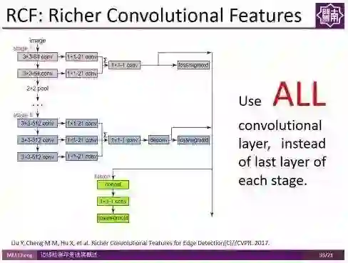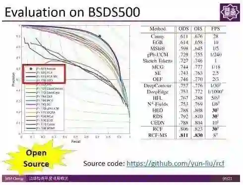 该方法操作简单,且不明显增加计算时间,虽然代码量少,但在BSDS500数据集上的结果甚至超过人类标注者的平均表现水平,而且在Titan X上能够达到实时检测速度(30fps)。且,这部分代码是开源的,可通过访问如下网址获得: https://github.com/yun-liu/rcf。