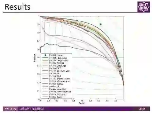 上图展示了过去45年间特别有代表性的工作在 Berkekey Segmentation Benchmark 上的PR(Precision-Recall)曲线。右上角绿色点是人类表现的均值,F-Measure值在0.8左右。