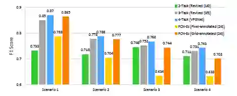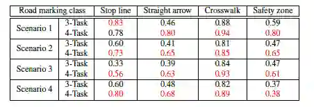 对停止线,直线箭头,人行横道和安全区域评估了同时检测和分类性能。表3表明了3任务网络和4任务网络的性能。
