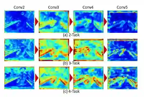 该部分,本文验证了多任务模块是否有利于对网络训练的提升。本文观测了在特征共享网络中激活的神经元。从底层到高层,抽象程度得到加速。