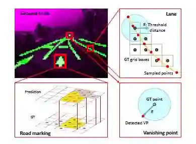 车道检测:因为基准库的真值用网格单元标注,本文计算了每个网格单元中心到每个单元车道采样点的最小距离。如果最小距离在边界R之内,将这些采样点标记为true positive以及对应的网格单元标记为detected。还测量了F1分数用于比较。