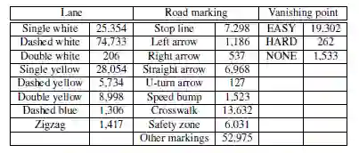 1.创建了包含约20000张图像的车道和道路标记基准数据集,其中包含4种不同场景下的17类车道和道路标志。