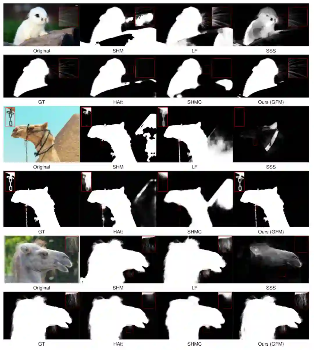 与 SOTA 方法相比,GFM 在所有评估指标上均超过它们,通过同时分割前景和背景图像以及在过渡区域抠图,取得了最优性能。