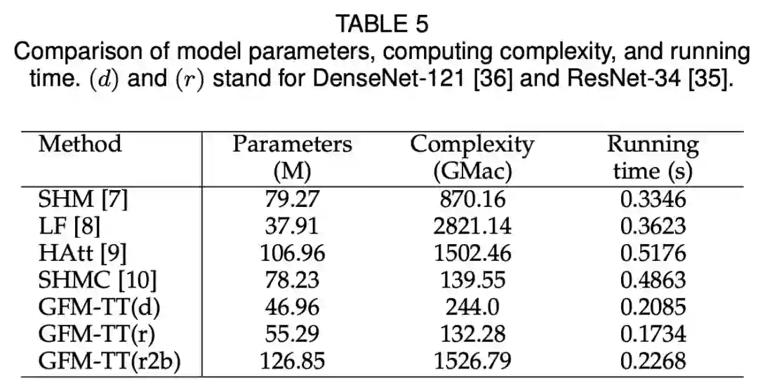 如下表 5 所示,使用 DenseNet-121 或 ResNet34 作为主干网络的 GFM 在运行速度上超过 SHM、LF、Hatt 和 SHMC,它们处理一张图像分别只需大约 0.2085s 和 0.1734s。