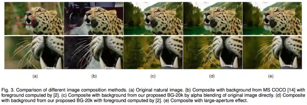 下图对比了不同合成图像方法,其中 c 和 d 使用的背景图像来自 BG-20k 数据集: