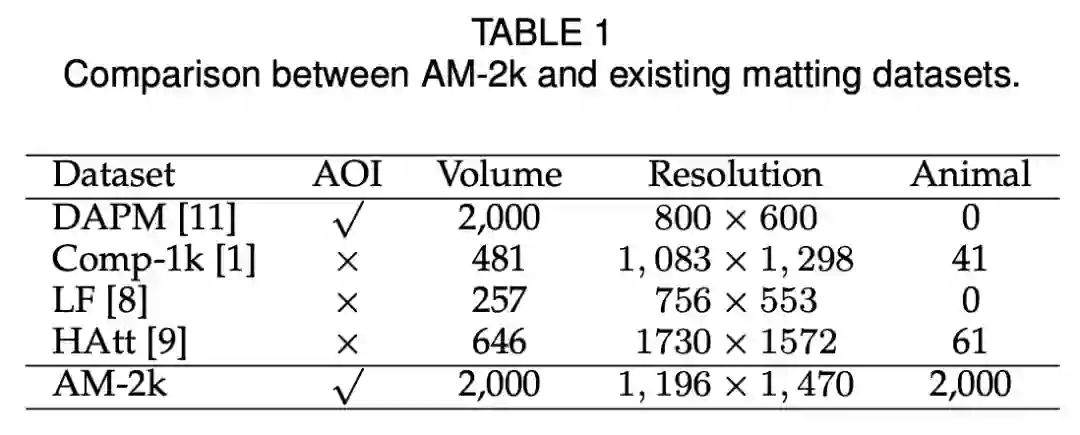 下表展示了 AM-2k 数据集与现有抠图数据集的对比情况: