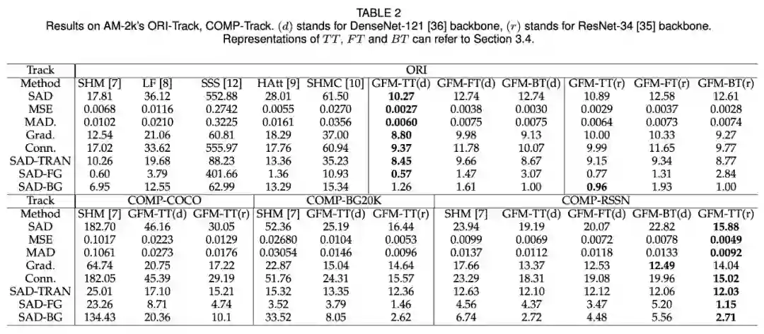 下表 2 展示了多种 SOTA 方法在 AM-2k ORI-Track 上的结果: