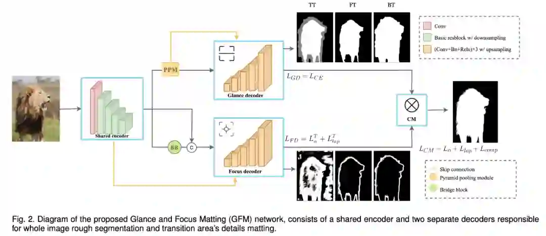 图 2:GFM 网络架构图示。它包含一个共享编码器和两个单独的解码器,解码器分别负责图像分割和细节抠图。