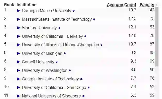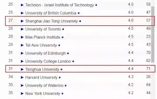 排名前三都是美国高校:卡内基梅隆大学、麻省理工学院、斯坦福大学。国内高校的话,上海交通大学以4.6的得分位列第 27 名,清华大学与爱丁堡大学、UCL 并列全球第 31 名