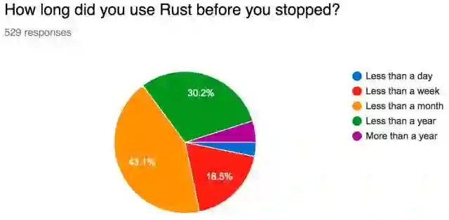 Rust 官方在社区上做了一次调查,以了解用户如何看待 Rust 的发展。Rust 目前主要被用于小型和中型项目,大型项目占比 16%(高于去年的 8.9%),这也表明用户越来越有兴趣将 Rust 用在大型项目当中。尽管开发者用 Rust 编写代码的量在增多,但在使用频率上,每天使用和每周使用的数据都有小幅下滑。 日使用用户从去年的 19% 下降至 17.5% ,周使用用户从 48.8% 下降到 43.3% 。