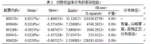 通过进一步观察对数收益率的描述统计量和JB检验可以看出:5只股票的对数收益率均呈现有偏,尖峰厚尾的特征,并且JB检验的p值均小于1%,拒绝正态分布假设,即5只股票的对数收益率分布均非正态分布。