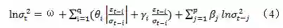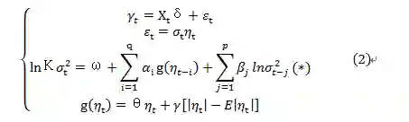 为了反映金融市场波动的非对称性,Nelson(1991)提出了EGARCH模型,对均值方程和波动率方程进行联合估计,可以表示为