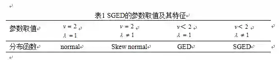 为了刻画这种非对称性,国外提出了一些前沿的分布来解决这样的问题。Fernandez和steel提出了将任意一个单峰、对称分布转变成偏态分布的一般方法。S-GED分布作为GED分布的扩展,它是在GED分布基础上加入一个偏态参数λ得到的。其定义如下: