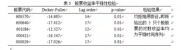(1) ARIMA(p,d,q)过程涉及p,d,q三个参数的设置,其中d代表使得原时间序列平稳时所做的差分次数,要对所选的5只个股股票对数收益率进行预测,首先检验各自的对数收益率序列平稳性,对于股票收益率的ARIMA(p,d,q)过程中d常取0,本文也在之后进行实证检验说明取d=0的合理性。实质上,此时的ARIMA(p,0,q)过程等同于ARMA(p,q)过程。