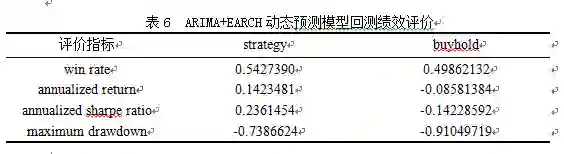 由以上结果可知,直观来看,使用ARIMA+EARCH动态预测模型总体效果较好,滚动预测累计收益率在后期更是远远超过简单的买入持有策略的累积收益率。用下表对ARIMA+EARCH动态预测模型绩效最进一步的评估: