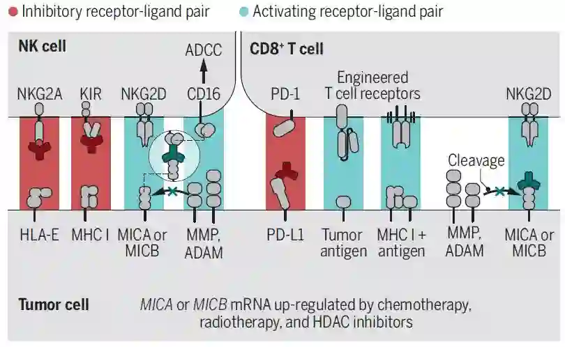 与CD8+ T细胞不同,NK细胞是天然淋巴细胞,能够表达“识别肿瘤细胞和病原体感染细胞表面配体”的受体,如NKG2D(NK group 2D)受体。NKG2D-NKG2D配体轴(NKG2D–NKG2D ligand axis)是人类NK细胞介导的肿瘤细胞和病毒感染细胞识别的主要激活通路。
