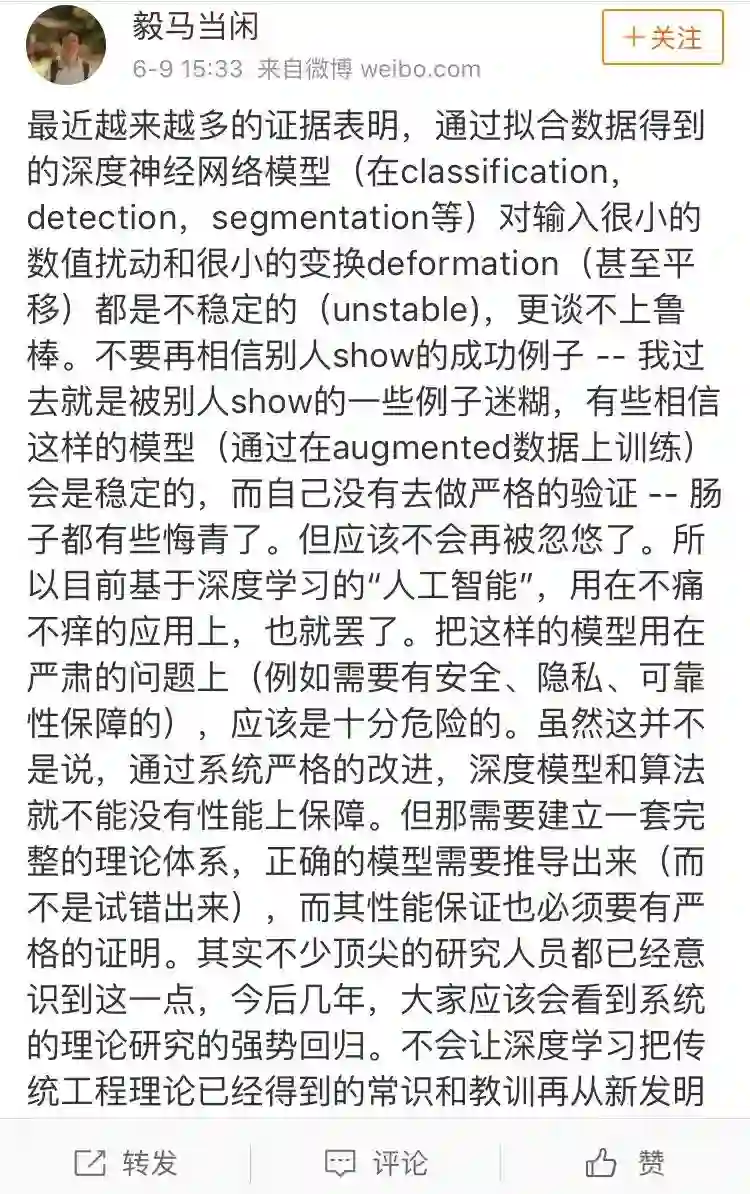 UC伯克利大学教授马毅最近也发微博称,越来越多的证据表明,通过拟合数据得到的深度神经网络模型(在classification,detection,segmentation等)对输入很小的数值扰动和很小的变换deformation(甚至平移)都是不稳定的(unstable),更谈不上鲁棒。