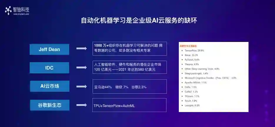 与此同时,机器学习目前严重依赖数据科学家,并且面临人才匮乏、人力成本高、时间成本高等问题,企业对无监督或者自主的学习的需求日益旺盛。