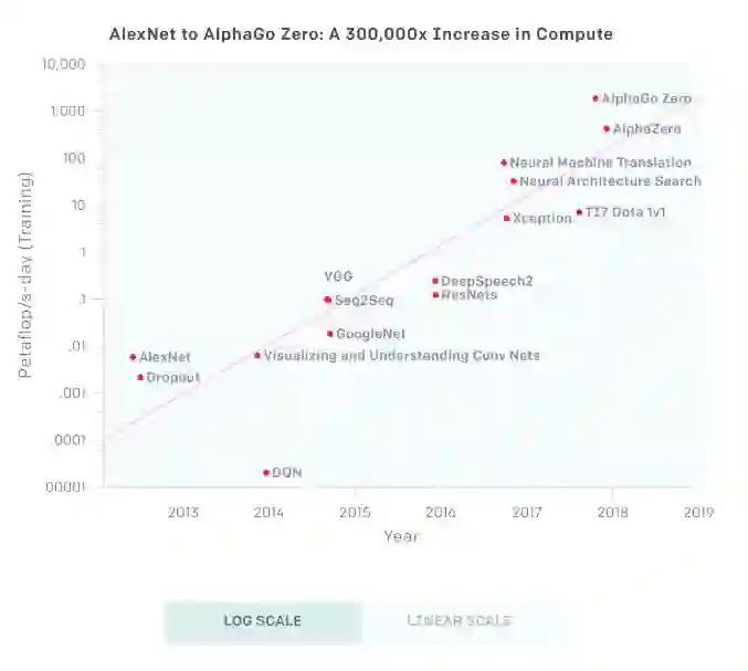 OpenAI最近发布的一份关于AI计算能力增长趋势的分析报告显示,自2012年以来,AI训练中所使用的计算力每3.5个月增长一倍,自2012年以来,这个指标已经增长了30万倍以上,这远远超过摩尔定律的增长。这种突飞猛进的速度让深度学习以及机器学习充满着无限的可能,充满了爆发性的增速。
