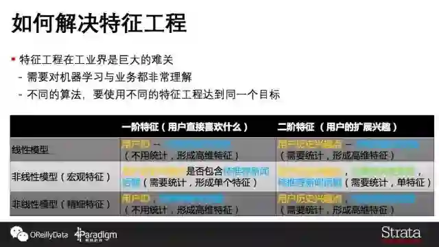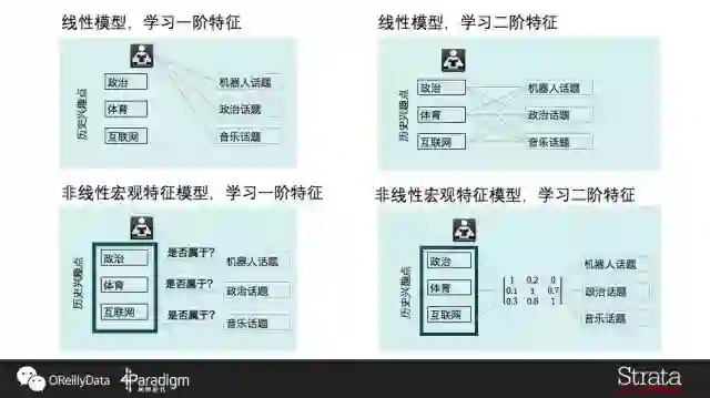 回头看,如何在之前提到的“复杂模型(非线性模型)+宏观特征”这条路添加一阶特征呢?如图左下角所示,由于是宏观特征,我们需要将不同的话题变成单个特征,一种做法是通过一阶逻辑的判断“本篇新闻的话题是否属于用户历史的兴趣”加入。这种方式下,在线上服务的时候,我们除了需要推荐实时信息之外,还需要实时维护用户历史的兴趣点,但是模型本生的更新频率就不用那么快了。毕竟,为了达到推荐时效性目标,要么特征静态、模型特别实时,要么特征实时、模型静态不变。