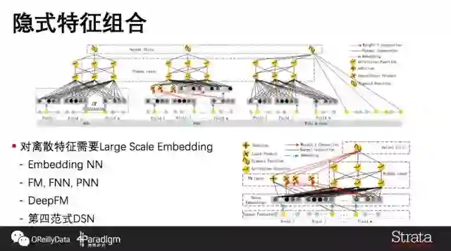 Large Scale Embedding在现在依然是一个比较热门的研究领域,其中的成果包括Discrete Factorization Machine,FNN, PNN, DeepFM等,上图显示了这些算法的异同,简单来讲这些模型既能找到特征之间的推理关系,同时也能去记忆比较细的特征。在这个领域,第四范式提出了DSN(Deep Sparse Network)的算法,它是一个非常宽且深的模型,里面同样会做大规模Embedding,用神经网络做自动学习组合,目标解决高维模型(上万万亿VC维度)的正则化以及并行计算问题。