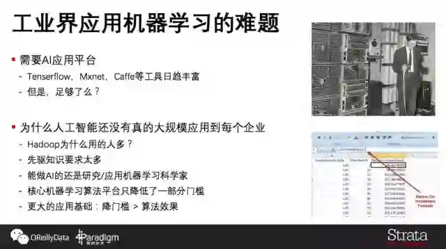 刚才说到的还只是一个公司的问题与系统,如果用在各行各业的不同问题上,会发现问题非常多,所以企业一定需要一个集成上述所有能力的人工智能平台。开源社区内好的工具平台和算法能够起到很大作用,这些工具也会日趋成熟,但并不足够。虽然看起来人工智能已经在非常多的领域应用或者开始了突破性的尝试,但是如果对比Hadoop这样的分布式存储计算系统来说,还远远未普及。