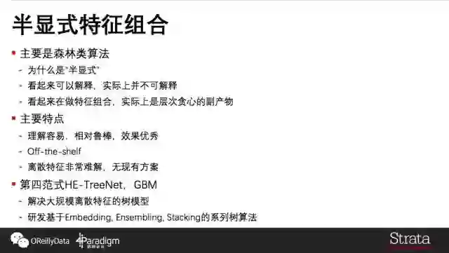 第二个是半显式的组合,主要基于的是树模型。为什么说是“半显式”呢?因为大家可能认为树模可解释或者做特征组合是很自然的事情,但其实并不是:叶子节点的每一个分支并不是一种显式、直接的特征组合,而是这些特征在特定取值区间的组合。所以从结果上来说我们做到了特征组合,有一定可解释性,但是同样也没有办法直接看特征相关性或者特征之间组合关系。作为非线性模型,树模型主要的特点是容易理解,效果也是非常好的。但是类似的,它对离散的精细特征非常难处理,传统上训练一棵m个特征n个训练数据k层深t棵树的模型需要O(mntk)的时间,即使对系数特征进行优化,也很难降低特征分裂中分桶上的空间与传输消耗。在这个方面,第四范式提出了一系列算法,包括HE-TreeNet和GBM系列算法,通过Embedding,Ensemble、Stacking,General Boosting等方式让树模型可以在大规模特征的情况下可以进行特征组合。