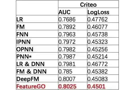我们在4个数据及上实验了FeatureGO算法,包括两个公开的数据集(higgs、criteoDeepFM)与两个我们私有的数据集(l_data,m_data),数据集统计信息如下:
