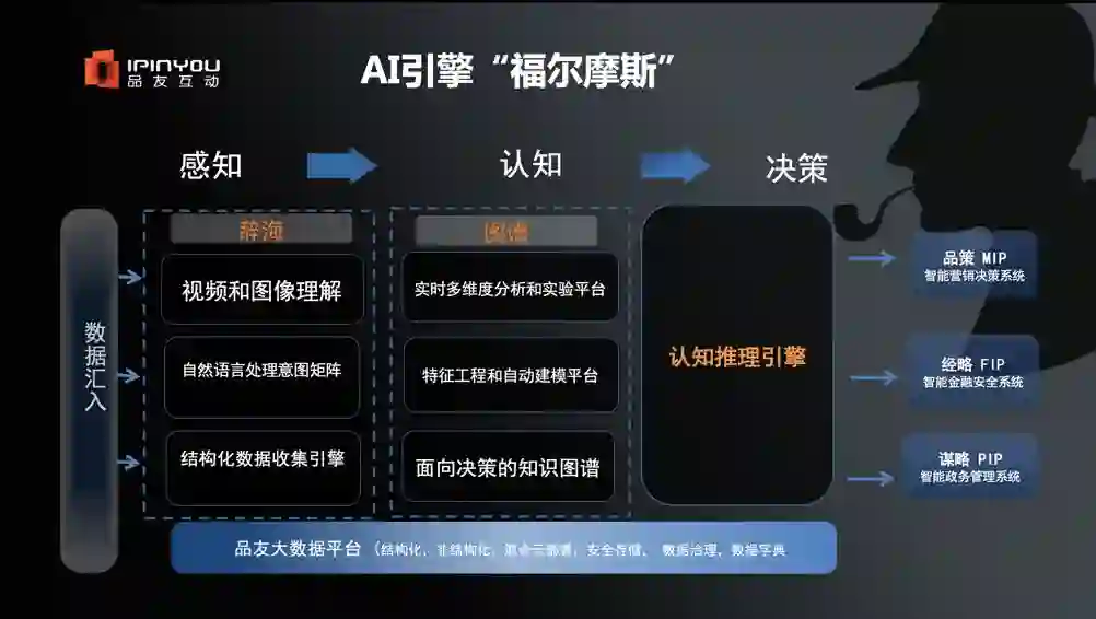 品友将技术算法打造成核心的技术中枢:AI引擎“福尔摩斯”。在多个公开场合黄晓南也向大家介绍过“福尔摩斯”的技术结构。可以理解为“感知、认知和决策”三个部分。