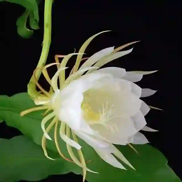 昙花开放时,花筒慢慢翘起,绛紫色的外衣慢慢打开,然后由20多片花瓣组成的、洁白如雪的大花朵就开放了。开放时花瓣和花蕊都在颤动,艳丽而动人。