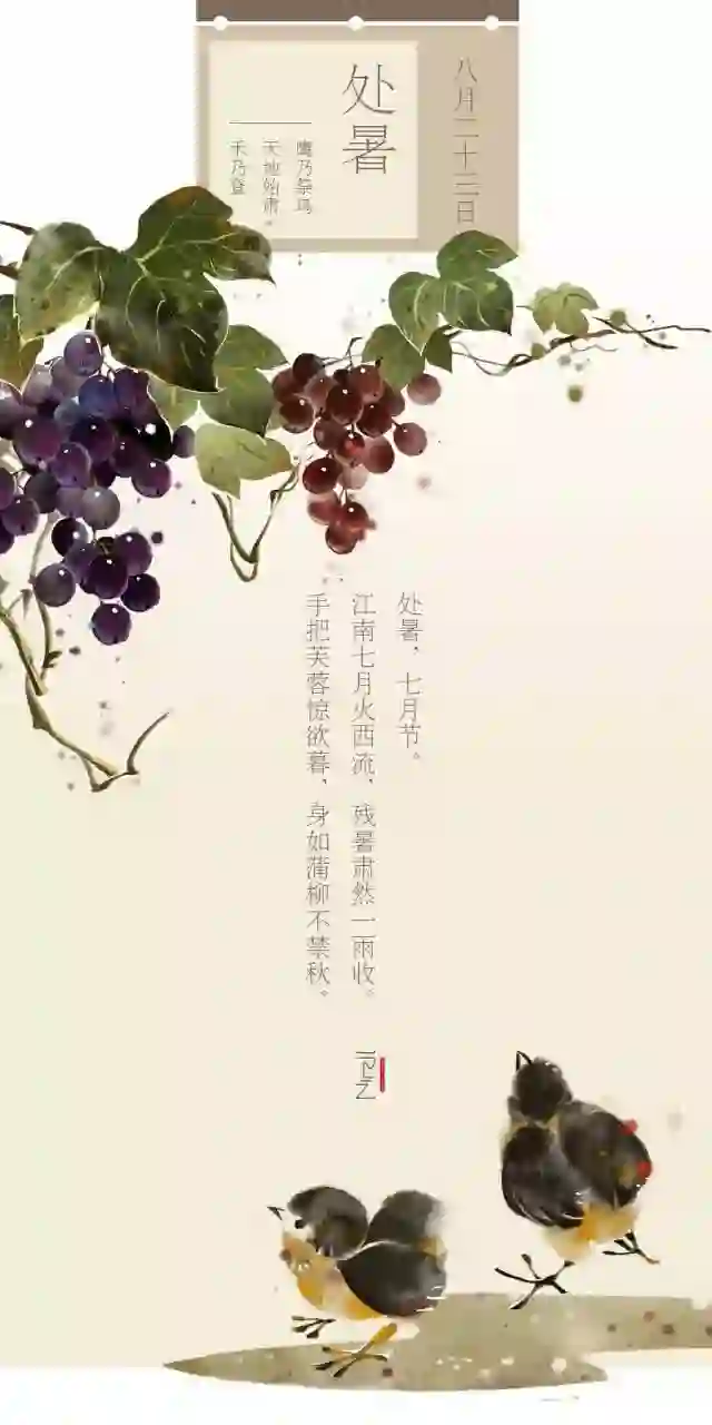 “处暑”意谓暑天停止或者结束。清人徐昂发《畏垒笔记》:“处暑”名目首见于《国语》范无宇之言,又引《注》云:“处暑,暑止也。”