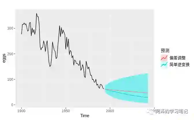 简单逆变换和逆变换的均值之间的差异,我们称之为偏差(Bias)。当我们需要用均值而非中位数时,称预测点是经过“偏差调整”(Bias-adjusted)的。下图展示了两者的区别: