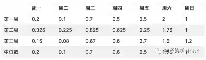 按列提取中位数是一种简单而有效的提取周期因子的方法。中位数十分鲁棒,不受极端值的影响。但中位数损失了很多信息。实践中,可以在此基础上进一步优化。比如可以提取一个均值和一个中位数,然后将均值和中位数融合。融合的比例按照测试集的表现来确定。也可以根据与预测周的时间距离来赋予不同的权重。