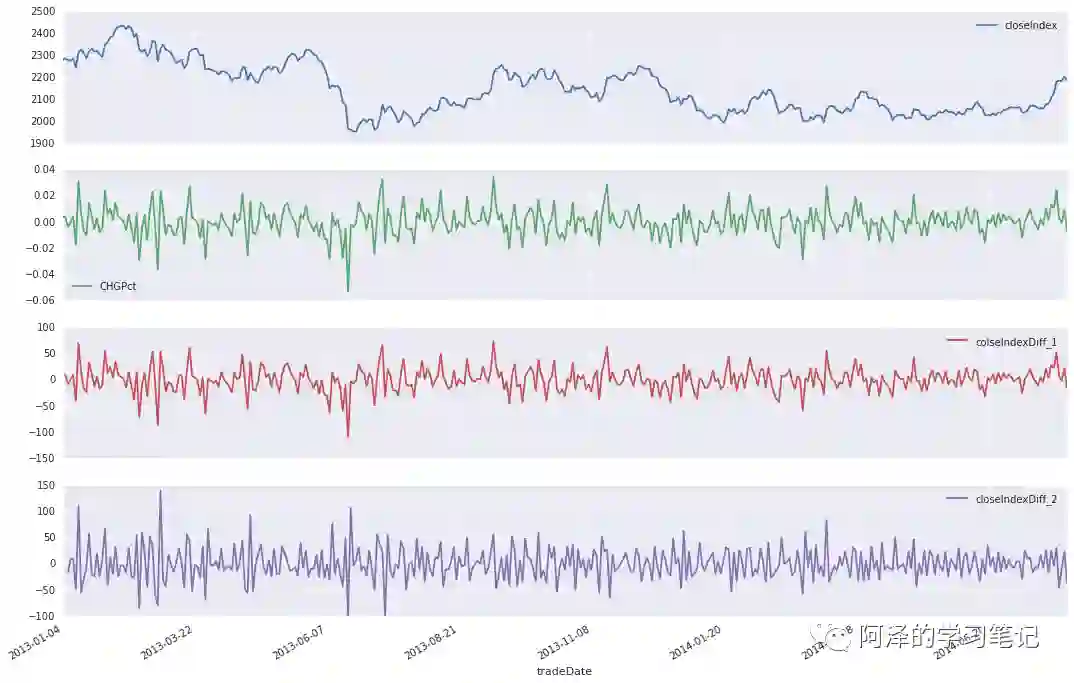 一般来说,做个一阶差分就可以得到接近平稳的时间序列了,如果方差随时间变化较大,那么可以先取 log 再做一阶差分。如下图所示:上面两张图为非平稳的时间序列,经过一阶差分后便得到了相对平稳的时间序列。当然,经过二阶差分后,其效果会更好。