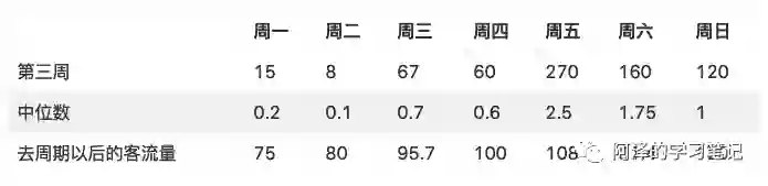 直接用最后一周的平均客流量作为base并不一定是最好的方法。也许最后三天或最后五天的均值能更好的反映最新的情况。但是,我们不能直接对最后三天客流量取均值(最后三天是周末,这样取的base就偏大了)。需要去掉周期性因素后,再取平均。具体做法,就是用客流量除以周期因子。