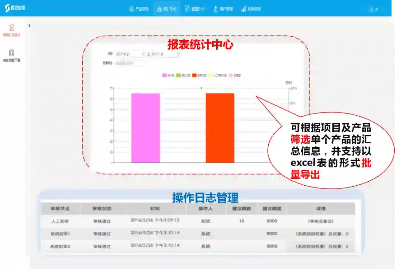 统计中心模块针对历史数据进行分析,通过多个维度形成图表,展示产品风险趋势,帮助业务人员控制业务风险。