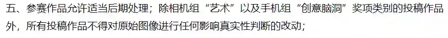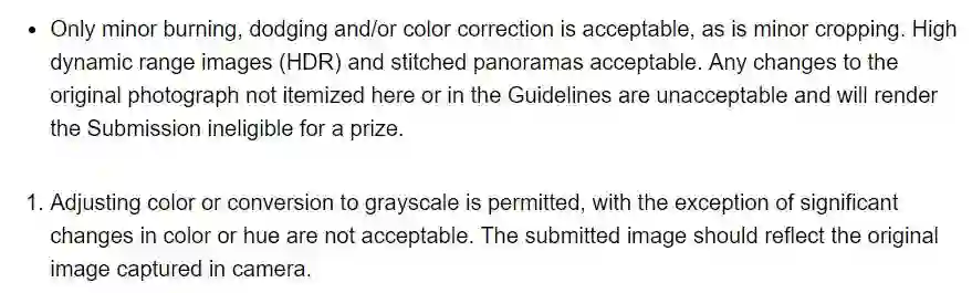 小幅度的加深减淡、色彩改变、后期裁剪是允许的。HDR曝光合并和全景拼接照片是允许的。彩色转成黑白是允许的。