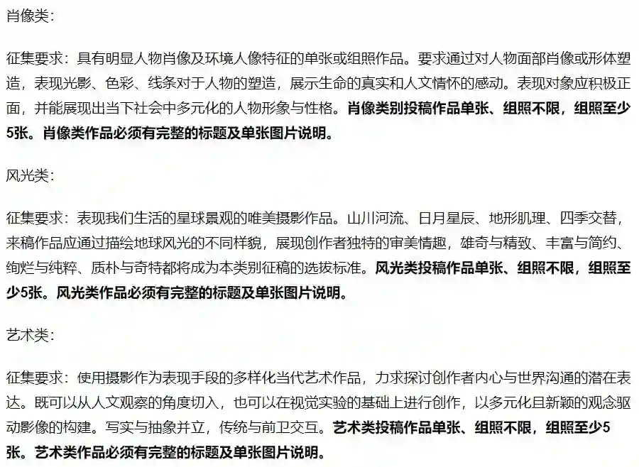 每个摄影比赛,都会有专门的页面,列举详细的参赛须知。