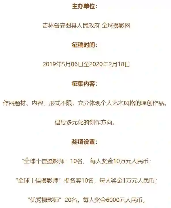 所有不需要参赛费(以及其他后续费用)的比赛,无论含金量高低,至少不会是坑钱的比赛了。这些比赛对摄影爱好者是极为友好的。