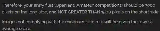 如果这些不对那肯定就白忙活了。 比如Epson Pano Awards,就要求照片的长宽比必须大于2:1,而且长边必须是不多不少的3000像素,要参与年度摄影师评选必须至少提交4张照片等。