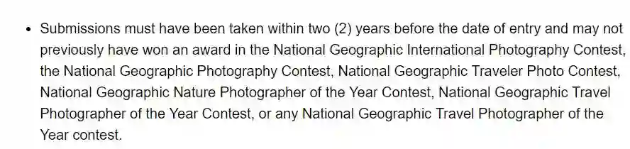 比如国家地理摄影大赛,就要求作品是2年内拍摄的,而且不能获得过国家地理的其他摄影奖项。