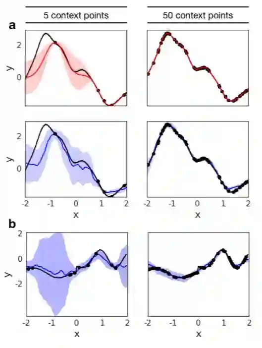 在论文《Neural Processes》中,DeepMind 介绍了基于神经网络的形式化方法,以学习随机过程的近似,他们将这种方法称之为神经过程(NP)。NP 能展示 GP 的一些基本属性,即学习目标函数的一个分布以逼近真实函数,NP 能根据上下文观察值估计其预测的不确定性,并将一些工作负载从训练转移到测试的过程中,这使得模型拥有更高的灵活性。更重要的是,NP 以高效计算的方式生成预测。给定 n 个上下文点和 m 个目标点,使用已训练 NP 进行推断对应着深度网络中的前向传播过程,它的时间复杂度为 O(n+m) 而不是经典高斯过程所需要的 O((n+m)^3)。此外,模型可以直接通过数据学习隐式的核函数,从而克服很多函数设计上的限制。