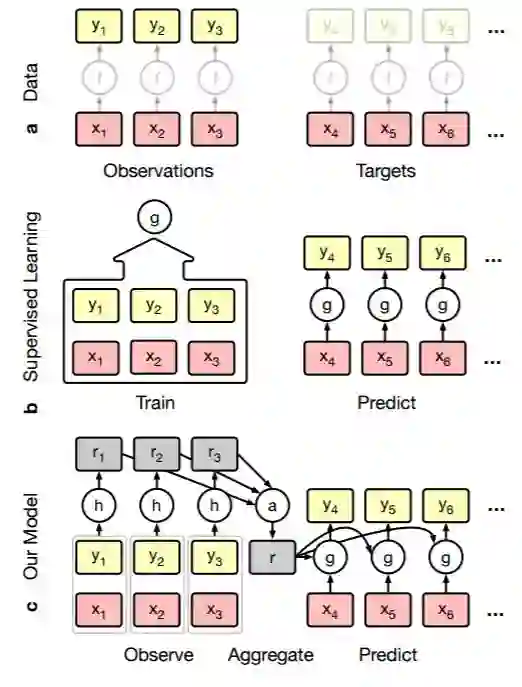 图 1:条件神经过程。a)数据描述;b)传统监督深度学习模型的训练方式;c)本文提出的模型。