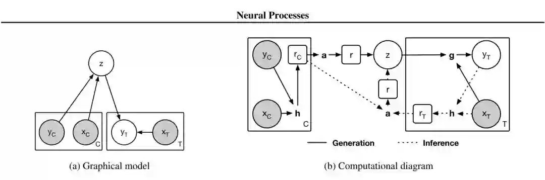 图 1:神经过程模型。(a)神经过程的图模型。x 和 y 对应着 y = f(x) 的数据,C 和 T 分别是上下文点和目标点的数量,而 z 表示全局隐变量。此外,灰色背景表示变量是已经观察到的。(b)为实现神经过程的计算图。圆圈里面的变量对应着这(a)中图模型的变量,方框里面的变量为 NP 的中间表征。而没有框的加粗字母分别表示以下计算模块:h 为编码器、a 为汇集器(aggregator)、g 为解码器。在该实现中,h 和 g 分别对应神经网络,而 a 对应均值函数。最后,实线描述了生成过程,而虚线描述了推断过程。