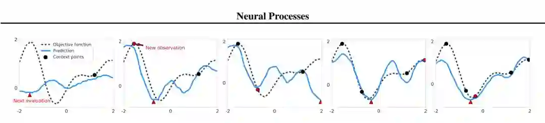 图 5:在 1-D 目标函数利用神经过程的 Thompson sampling。图中展示了五次迭代的优化过程。每个预测函数(蓝色)通过采样一个隐变量进行绘制,以上下文点数的增加为条件(黑色圆)。真实函数由一个黑色点线表示。红色三角形对应采样 NP 曲线的最小值的下一个评估点。下一次迭代中的红色圆对应该评估点及其真值,作为 NP 的下一个上下文点。