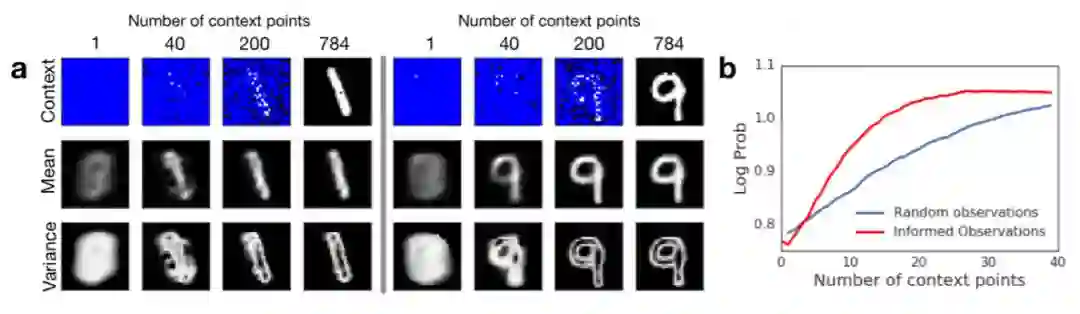 图 3:在 MNIST 上的像素级图像回归。左:不同观察样本数下的图像回归的两个示例。研究者向模型提供了 1、40、200 和 728 个上下文点(顶行),并查询完整的图像。图中展示了每张图像在每个像素位置得到的平均值(中行)和方差(底行)。右:随着观察样本数的增加的模型准确率变化,其中两条曲线分别是随机(蓝色)或按最高方差(红色)选择像素。